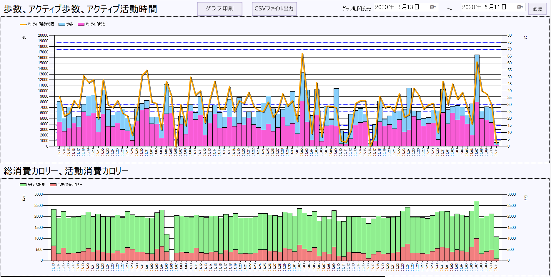 - 歩数・アクティブ歩数・活動時間・総消費カロリー、活動消費カロリーのグラフ表示